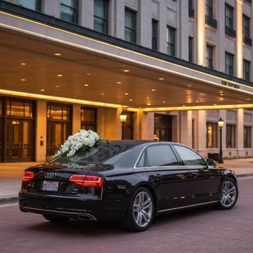 The sleek and elegant design of a limousine serves as a stunning backdrop for wedding photos. The polished exterior and stylish lines add a touch of luxury that enhances the overall elegance of the day. Photographers often use this unique setting to capture beautiful shots of the couple and their loved ones.
